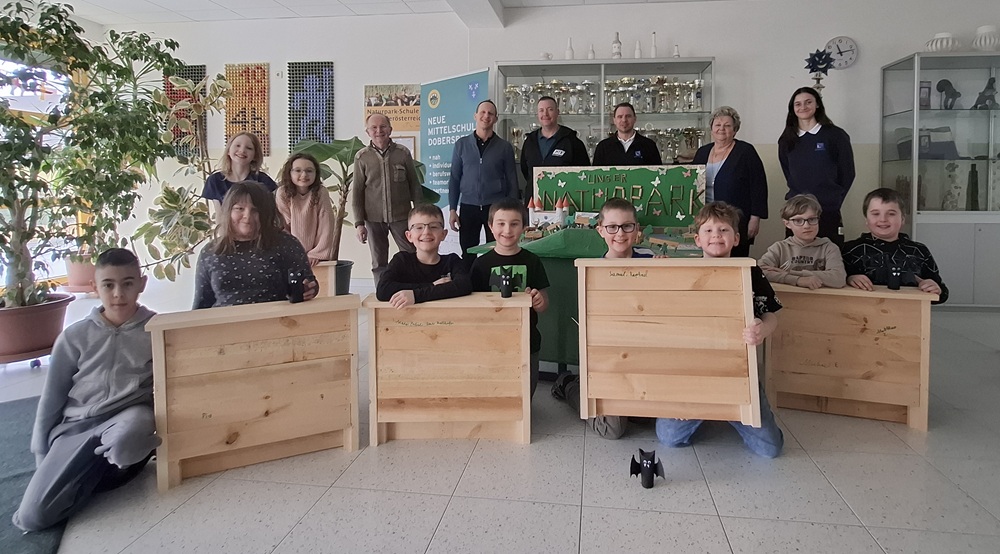 Hintergrund: Die Gebäude der ehemaligen Schnapsbrennerei Dobersberg werden abgerissen und in Zukunft wird das Grundstück anderwärtig genutzt. Es wurde zwar fachmännisch durch einen Fledermausexperten festgestellt, dass diese Gebäude bisher keine Winterquartiere für Fledermäuse waren, allerdings vielleicht als Sommerquartiere genützt werden könnten. Daher entstand die Idee schon vorab Fledermausersatzquartiere zu bauen und diese an geeigneten Stellen am Grundstück anzubringen. Nach mehreren Begehungen und Ausarbeitung eines fachmännischen Konzeptes eines anerkannten Fledermausexperten, wurden dem Grundstücksbesitzer Alexander Kainz Pläne vorgelegt, wie diese Ersatzquartiere auszusehen haben und wo sie angebracht werden sollen. Natürlich sollten sie aus Holz sein. Da kam auch rasch die Firma Holzbau Willibald Longin aus Dobersberg ins Spiel. Auf deren Unterstützung sofort gezählt werden konnte. Willibald Longin nahm sich persönlich Zeit und gestaltete gemeinsam mit Alexander Kainz die Werkstunde mit den Kindern. Die Kosten für Material und Arbeitszeit (Zuschnitt des Holzes) teilten sich die beiden Firmen, sozusagen als „Sponsoring für den Artenschutz“.